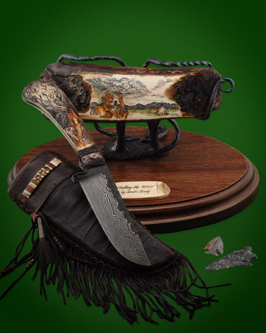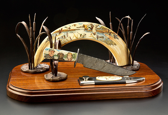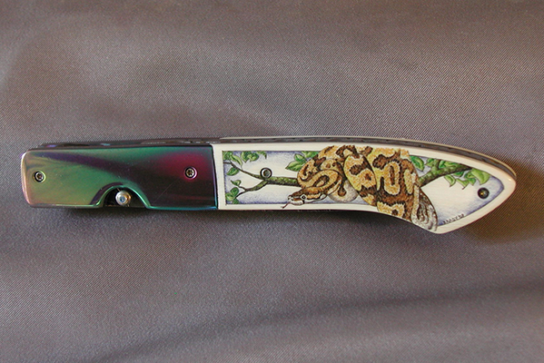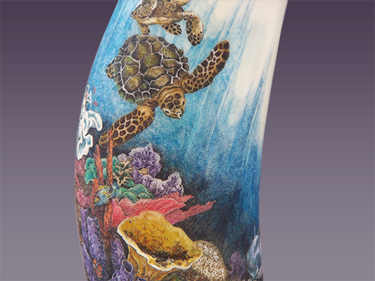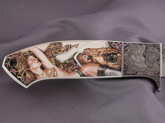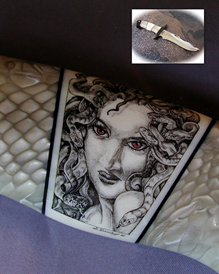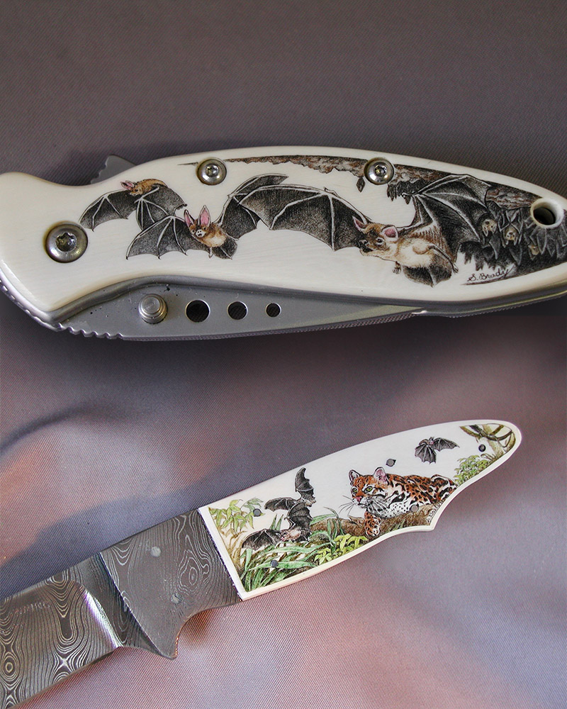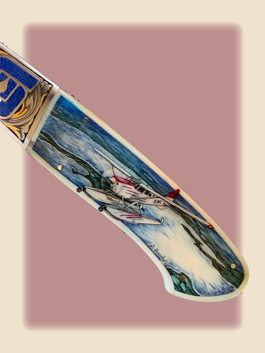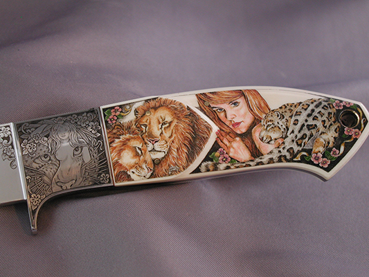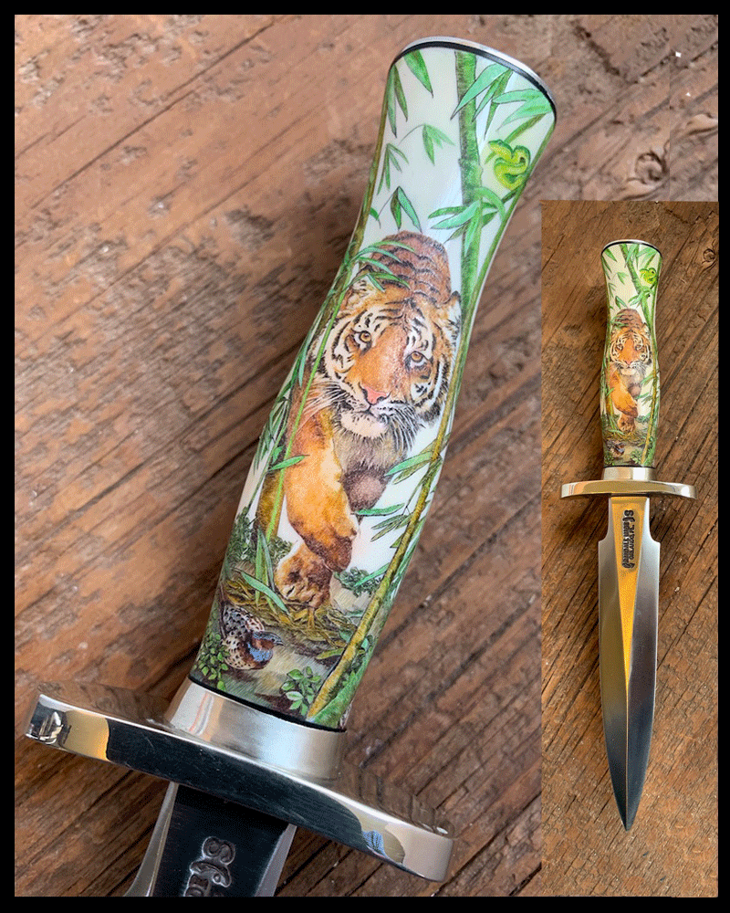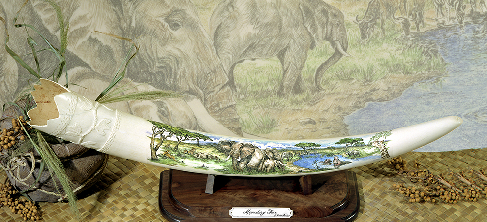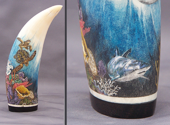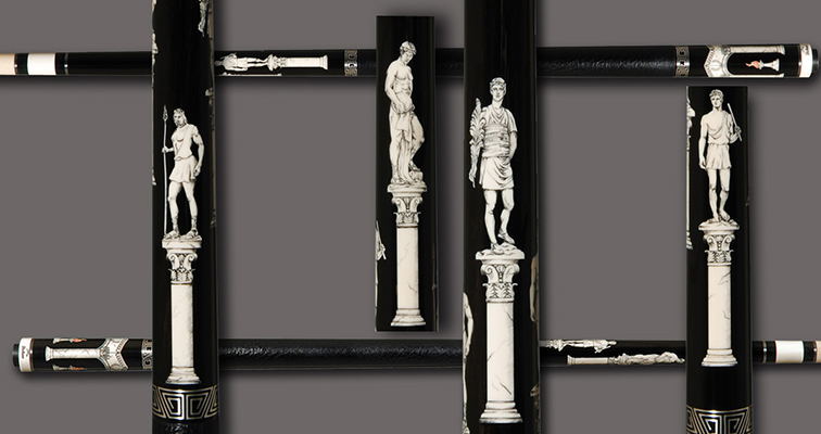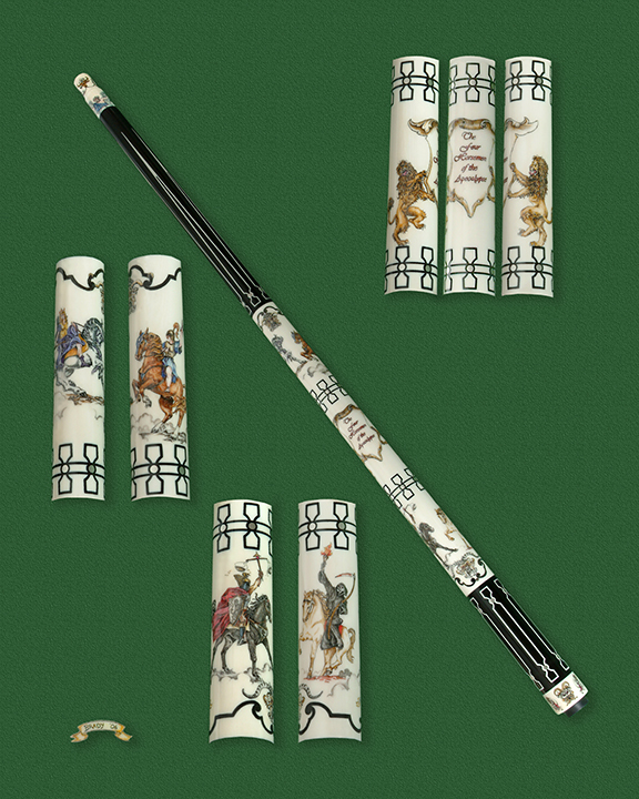 This cue is my most exciting, fun and challenging collaboration with cue maker Richard Black. My original design, Richard’s knowledge, skillful inlaying of various materials, and my scrimshaw artwork make this the most unique cue ever. You can check this out for a complete
