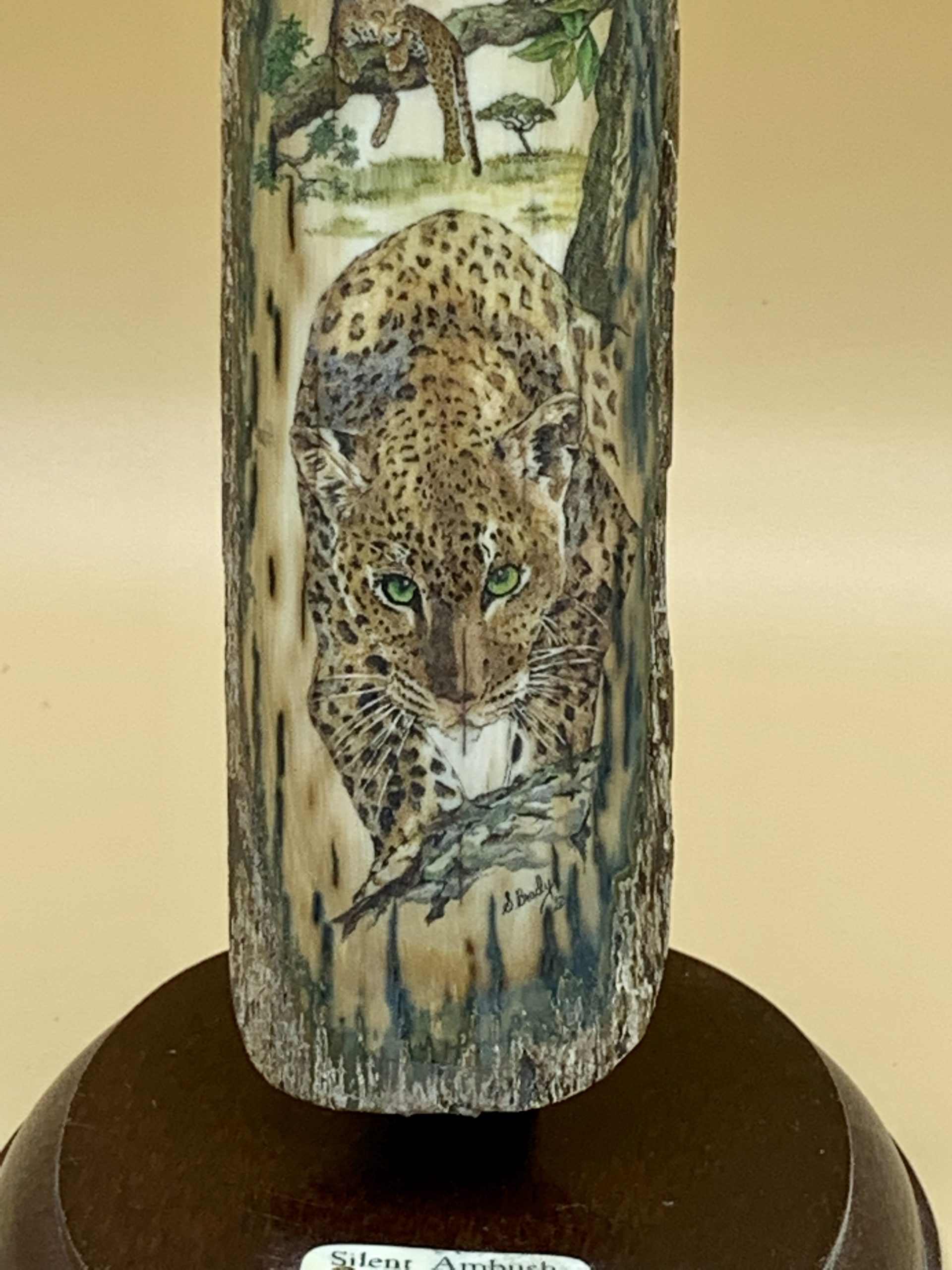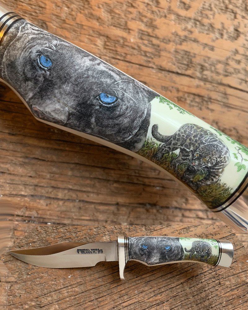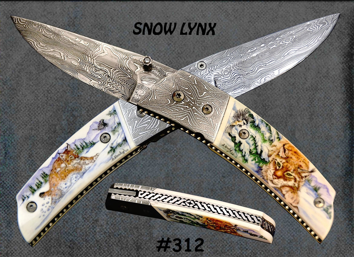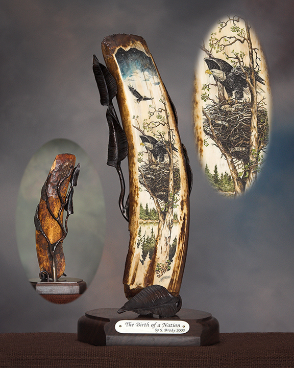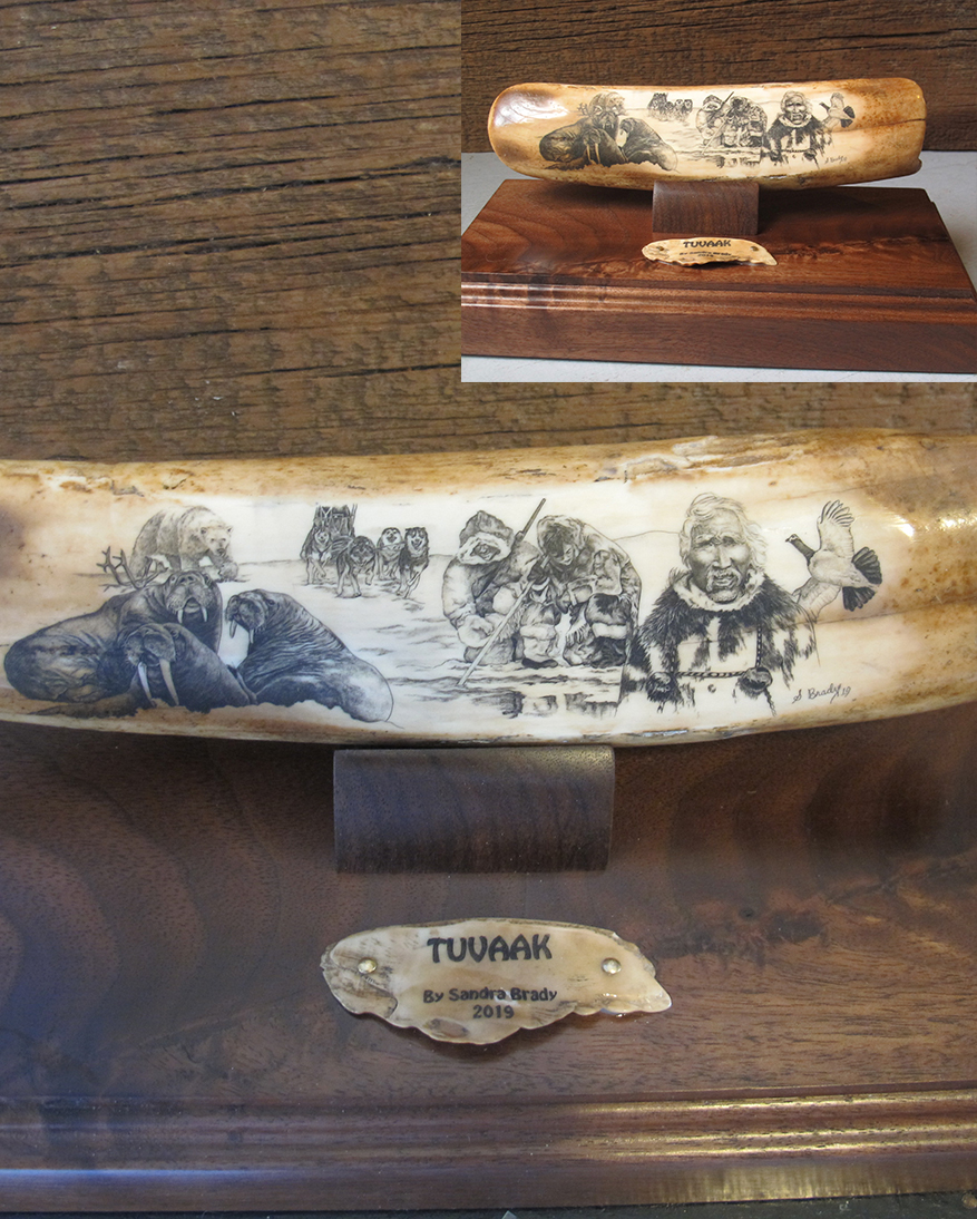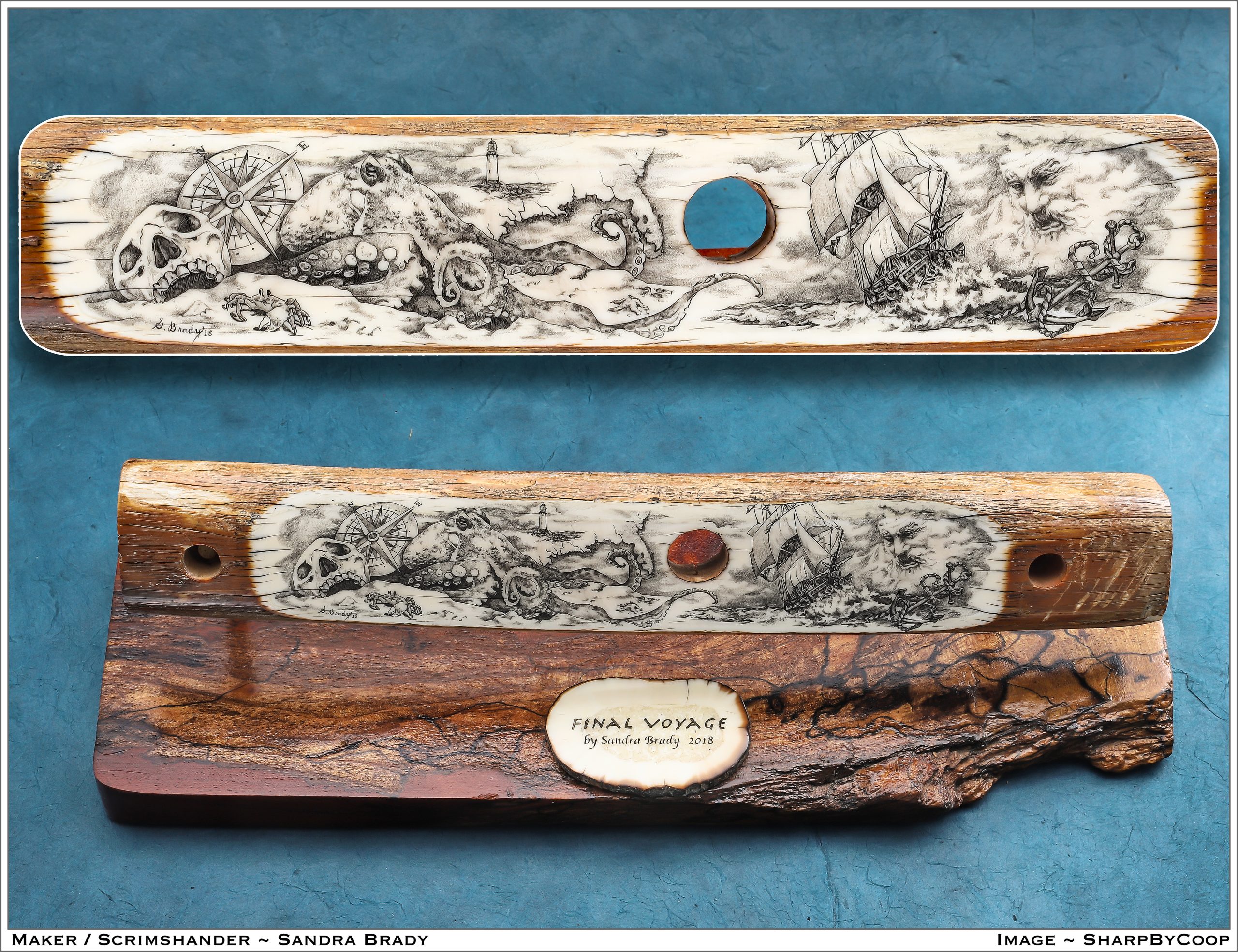This cue is my most exciting, fun and challenging collaboration with cue maker Richard Black. My original design, Richard’s knowledge, skillful inlaying of various materials, and my scrimshaw artwork make this the most unique cue ever. You can check this out for a complete