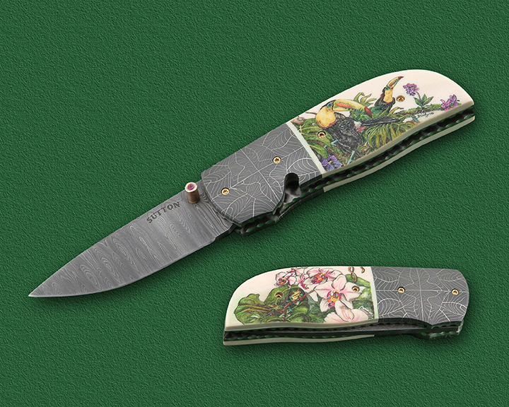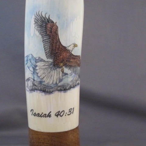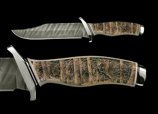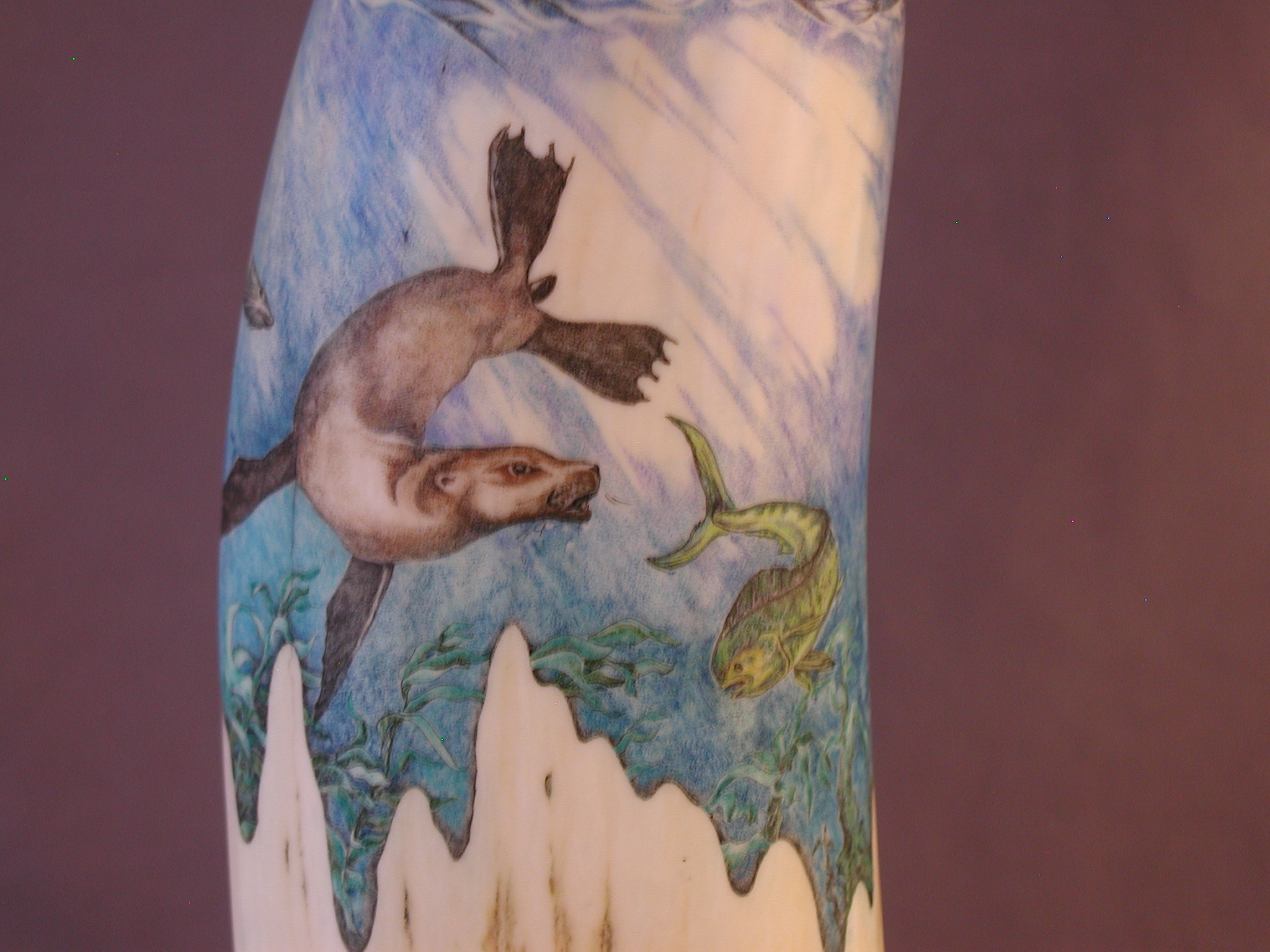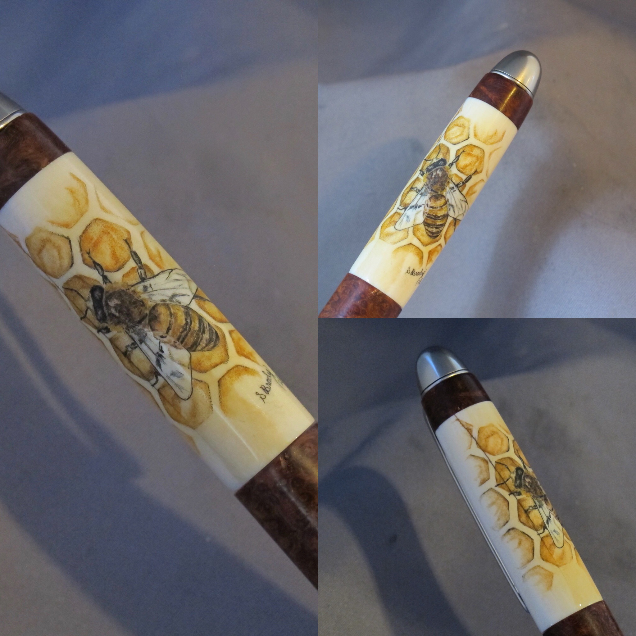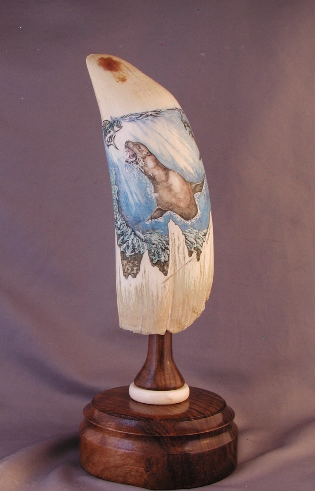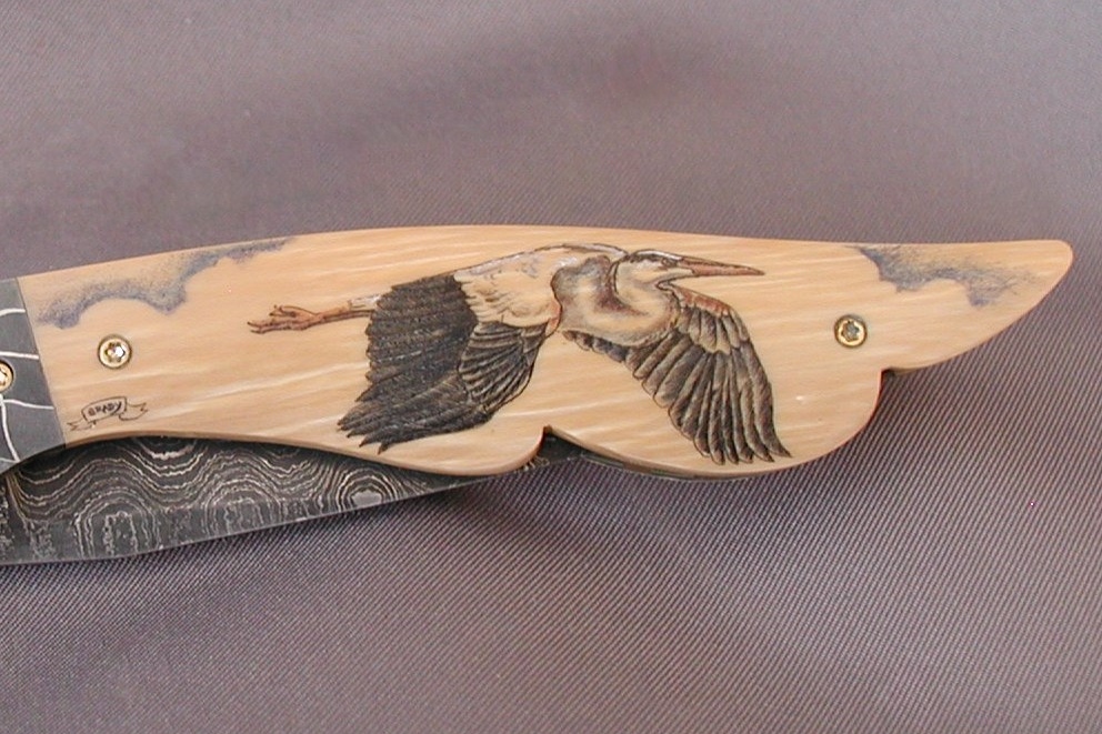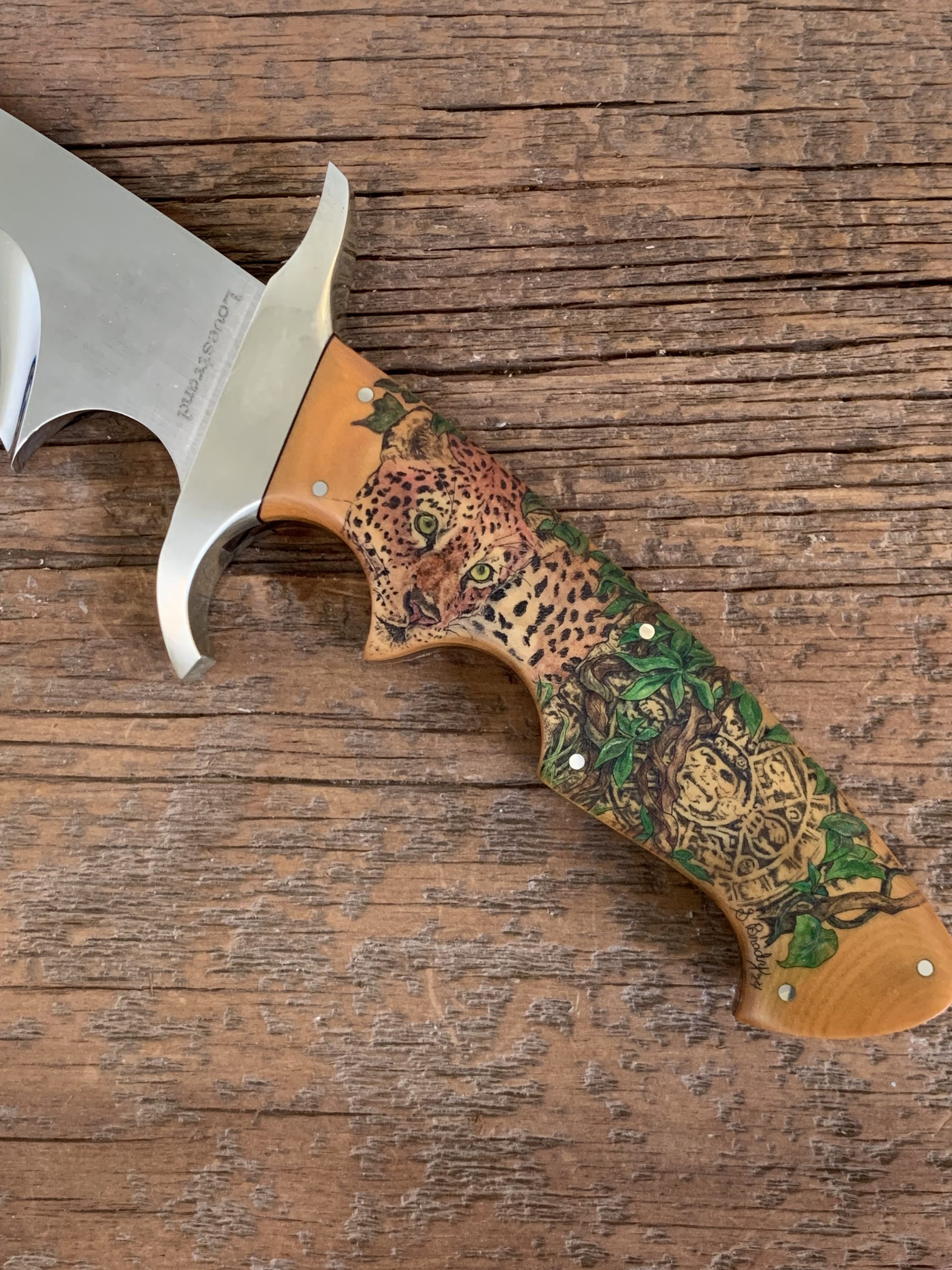 This cue is my most exciting, fun and challenging collaboration with cue maker Richard Black. My original design, Richard’s knowledge, skillful inlaying of various materials, and my scrimshaw artwork make this the most unique cue ever. You can check this out for a complete