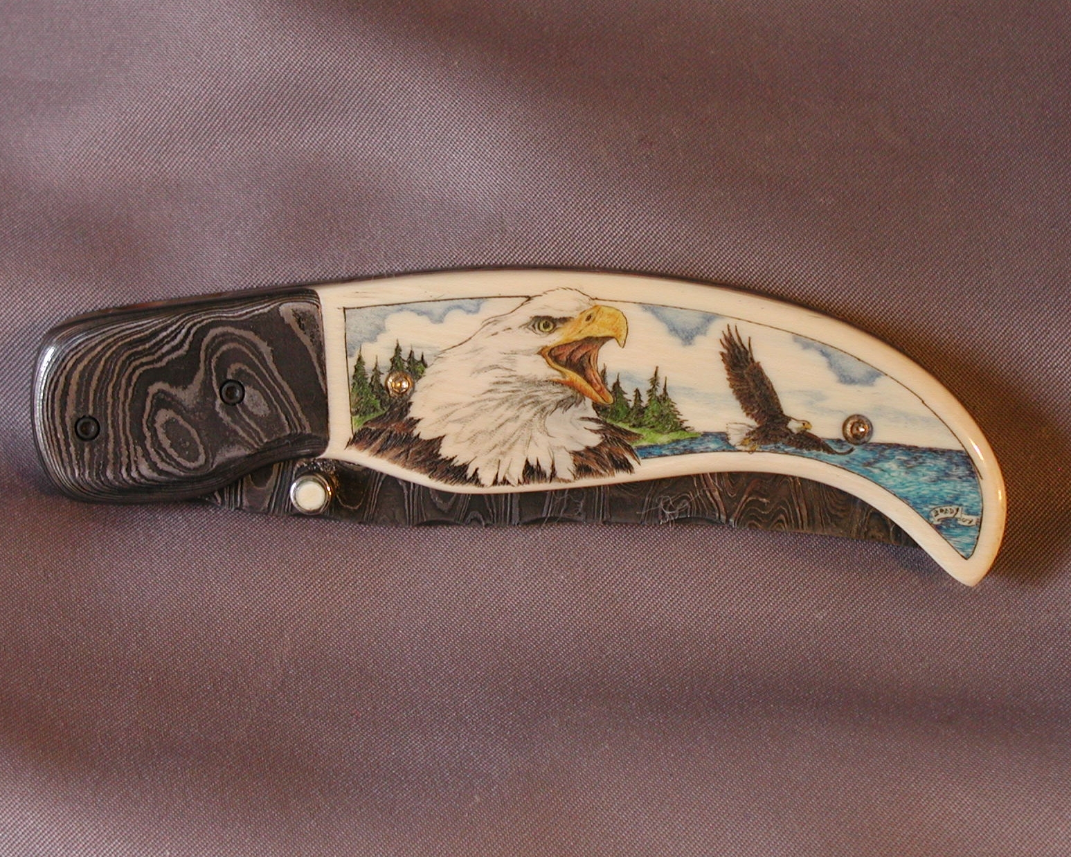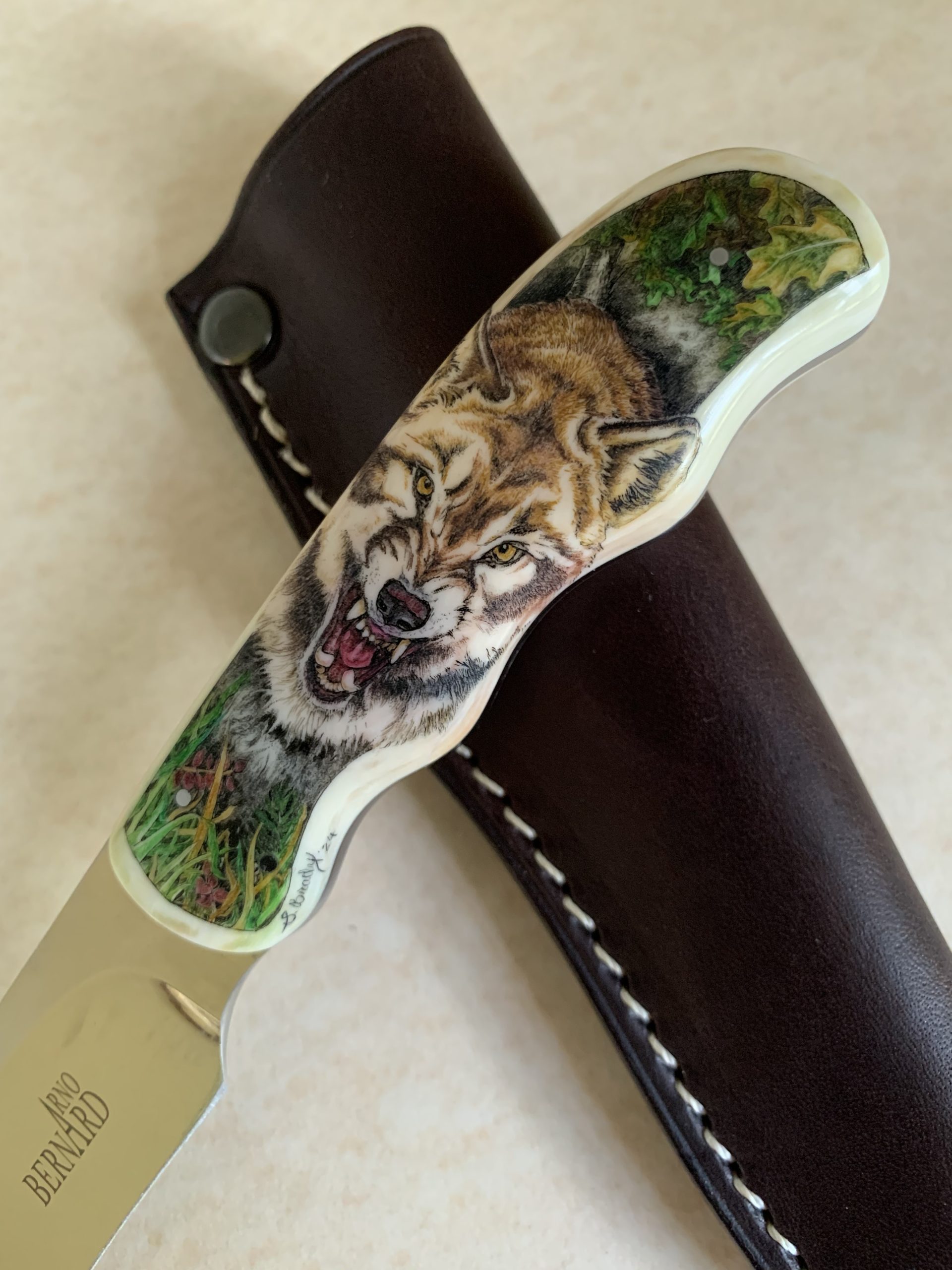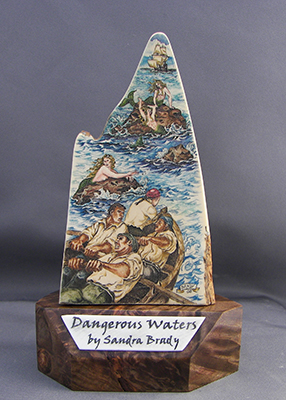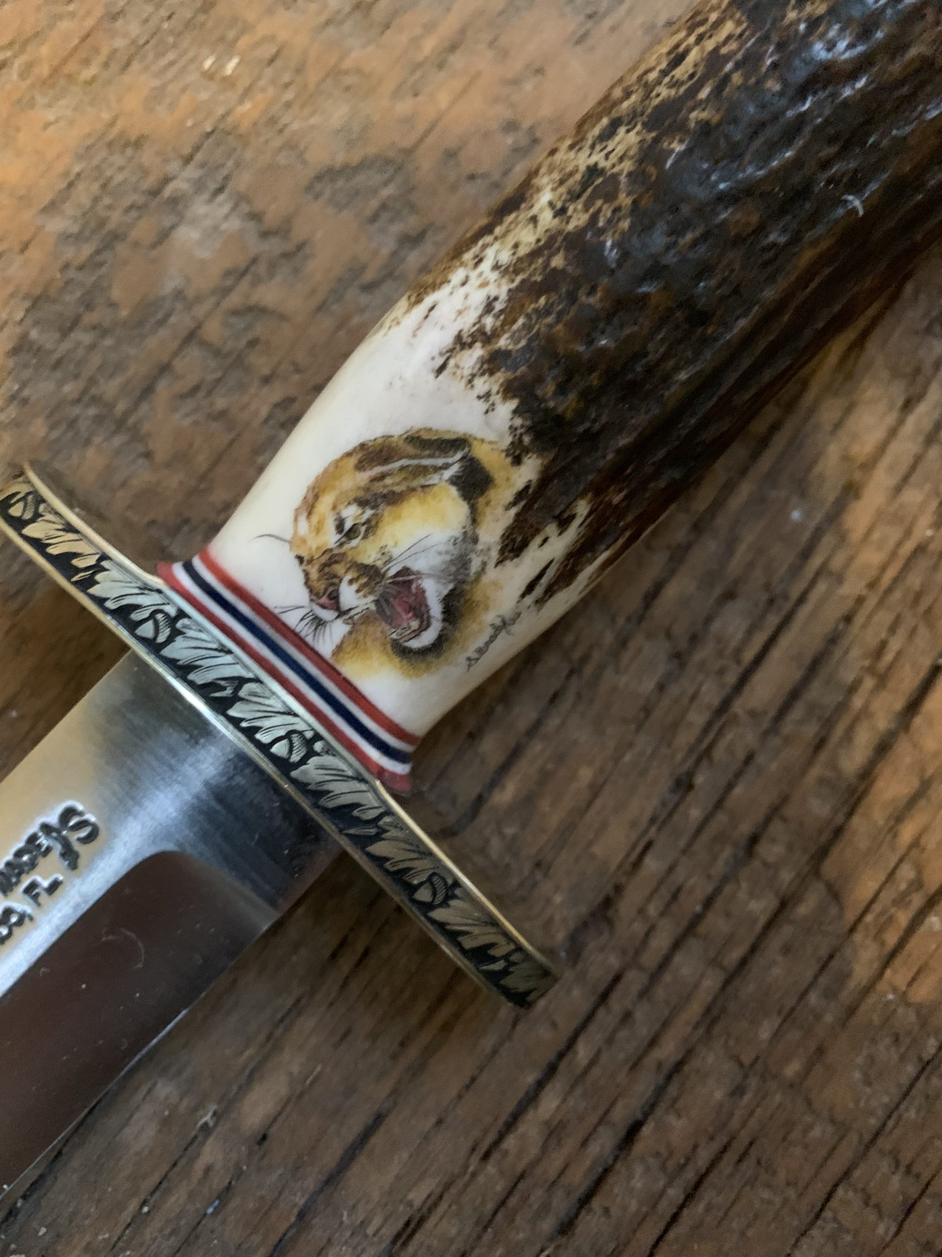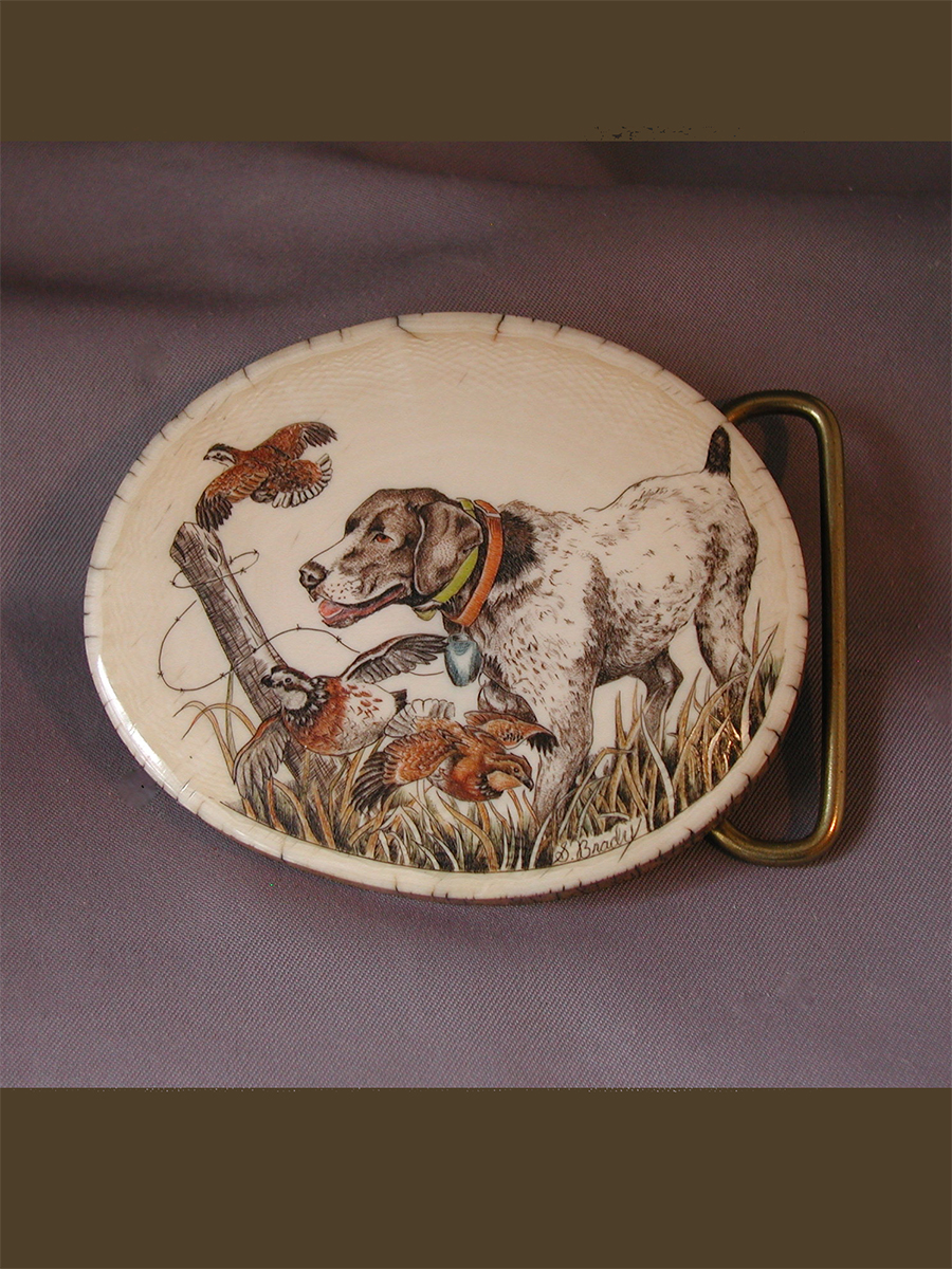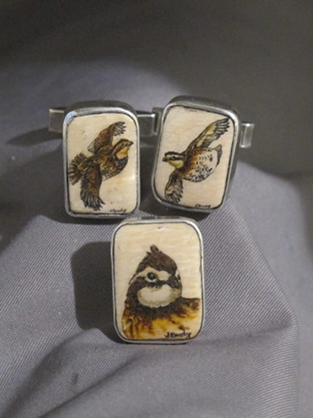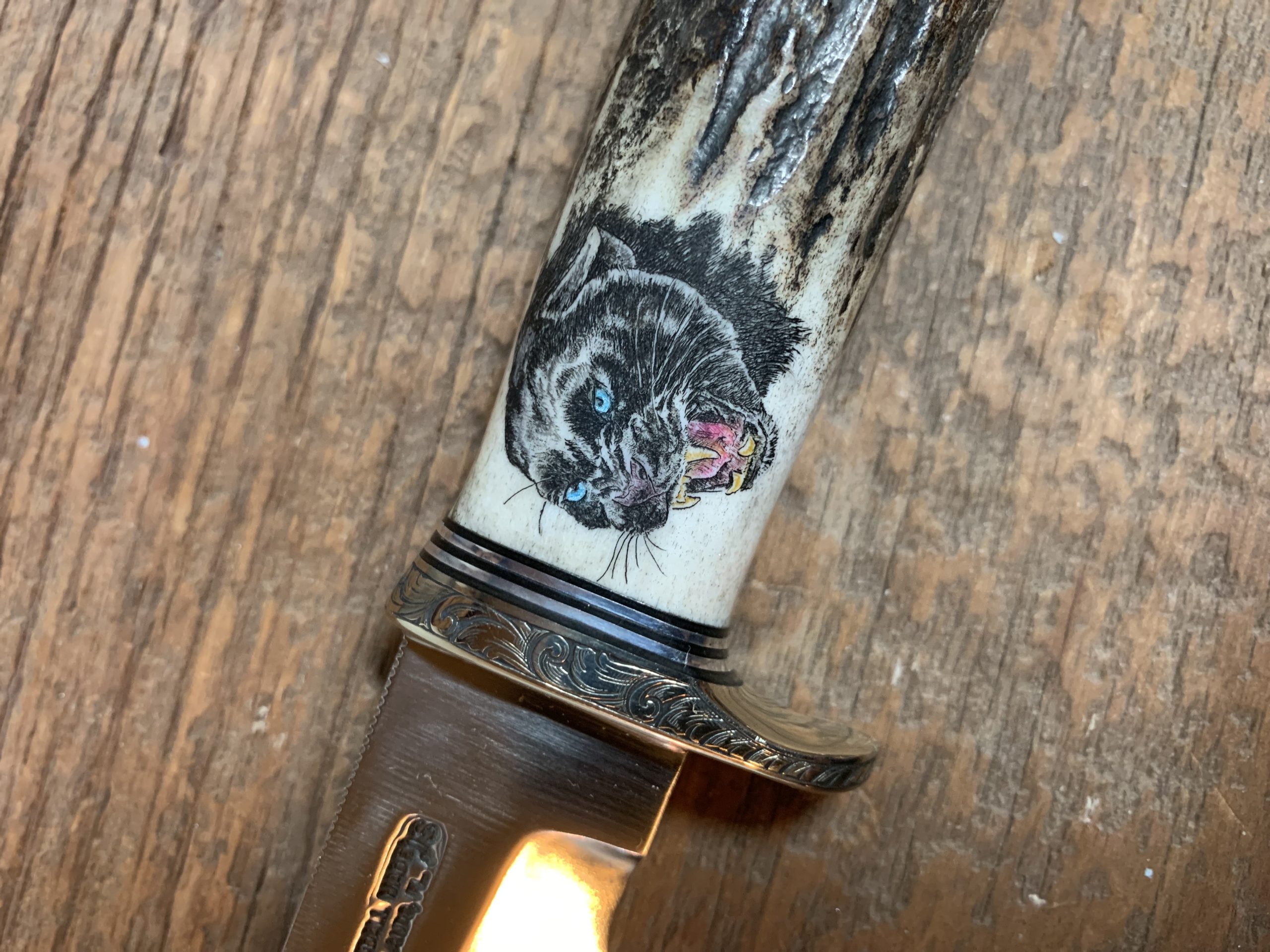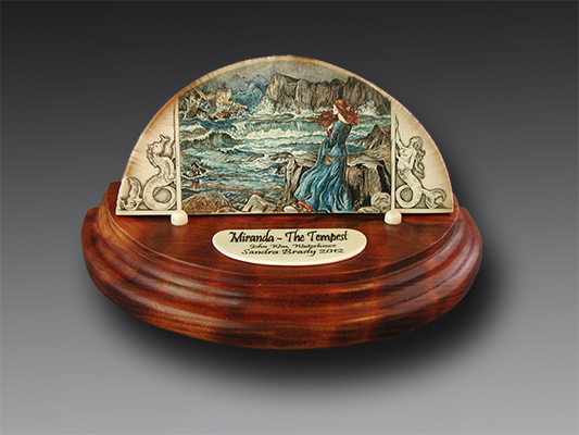 This cue is my most exciting, fun and challenging collaboration with cue maker Richard Black. My original design, Richard’s knowledge, skillful inlaying of various materials, and my scrimshaw artwork make this the most unique cue ever. You can check this out for a complete