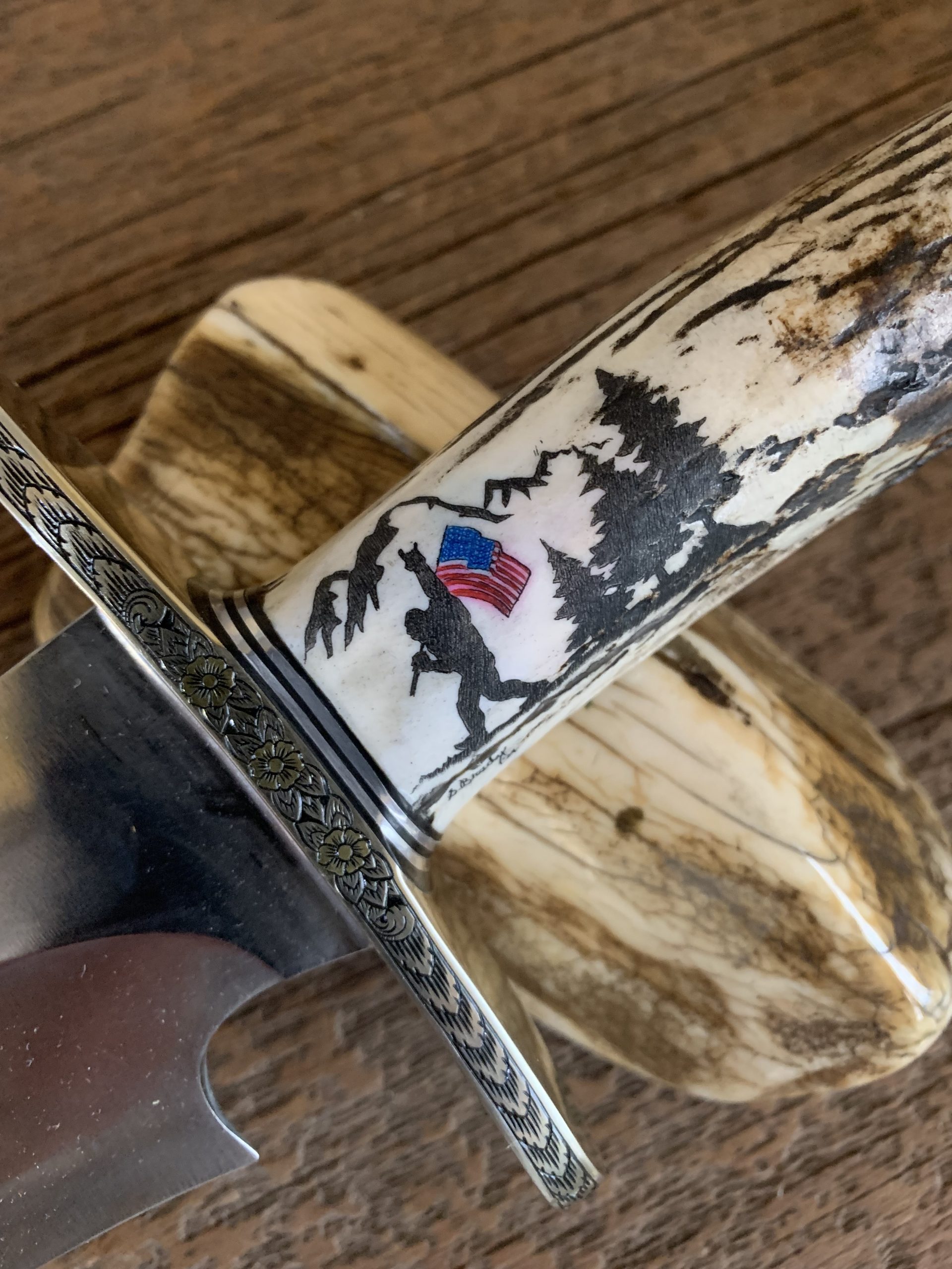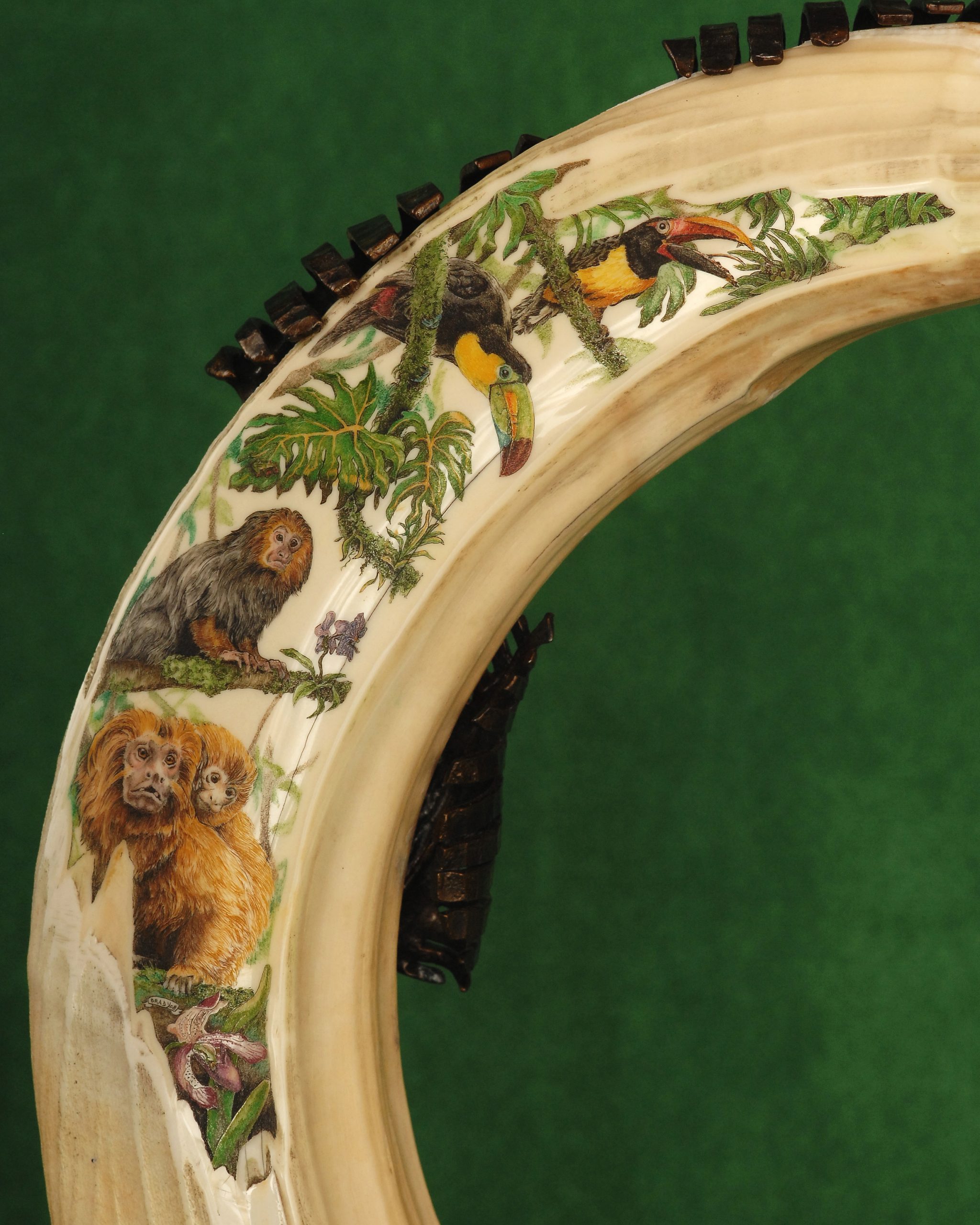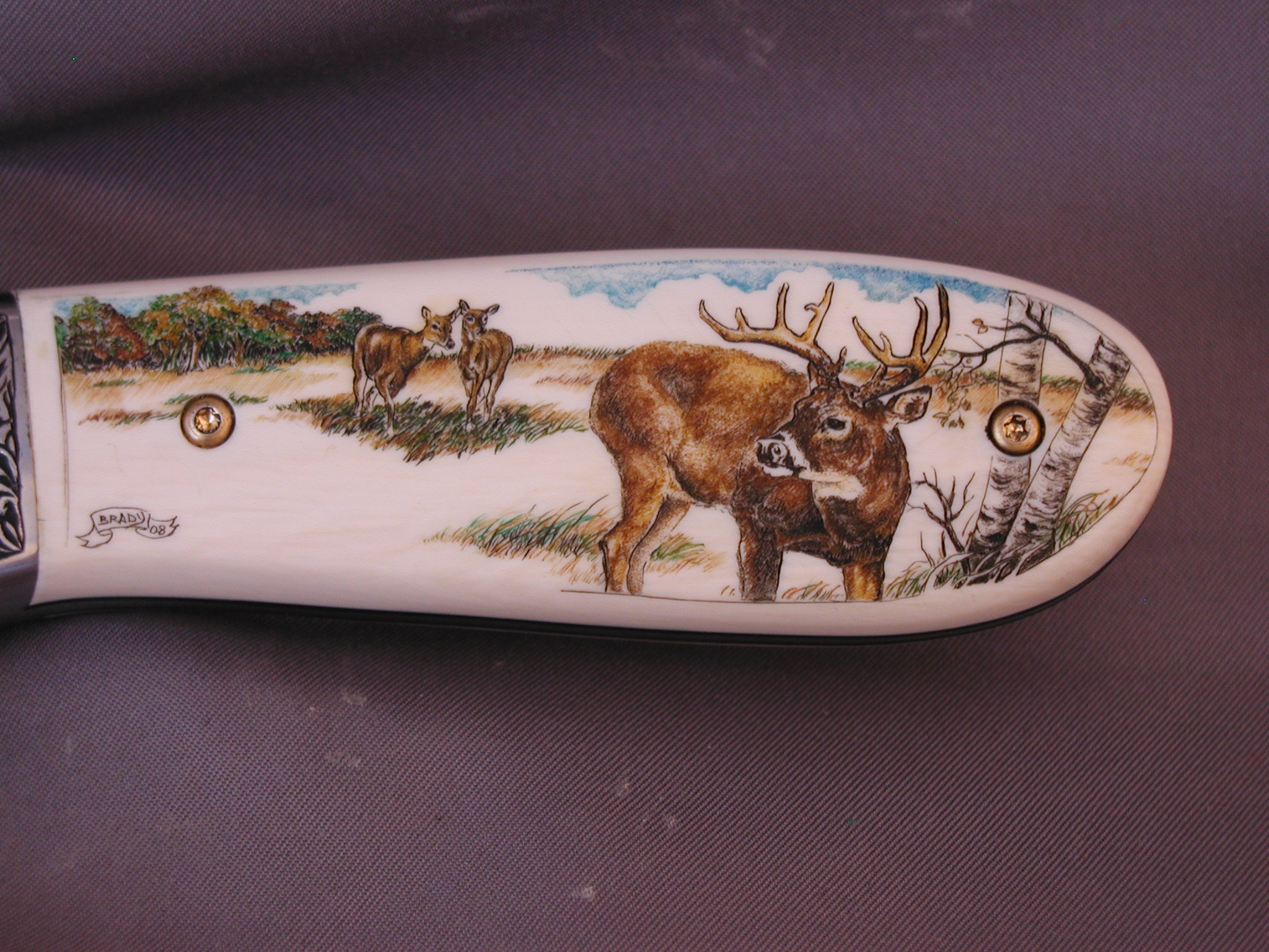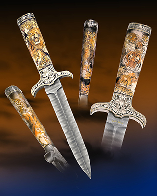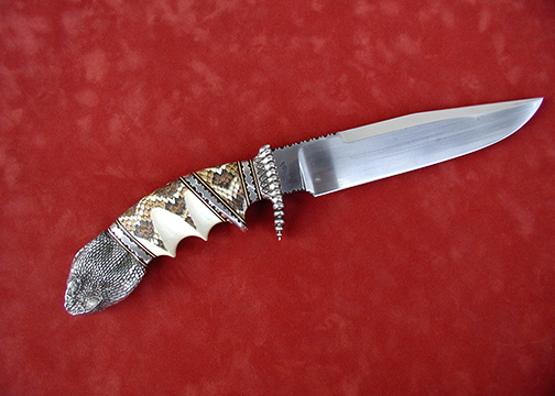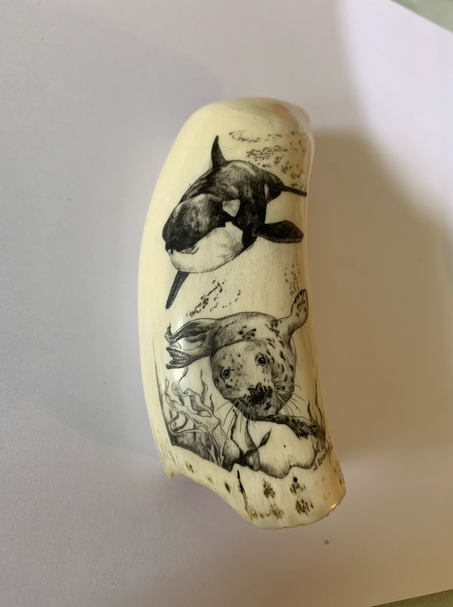 This cue is my most exciting, fun and challenging collaboration with cue maker Richard Black. My original design, Richard’s knowledge, skillful inlaying of various materials, and my scrimshaw artwork make this the most unique cue ever. You can check this out for a complete