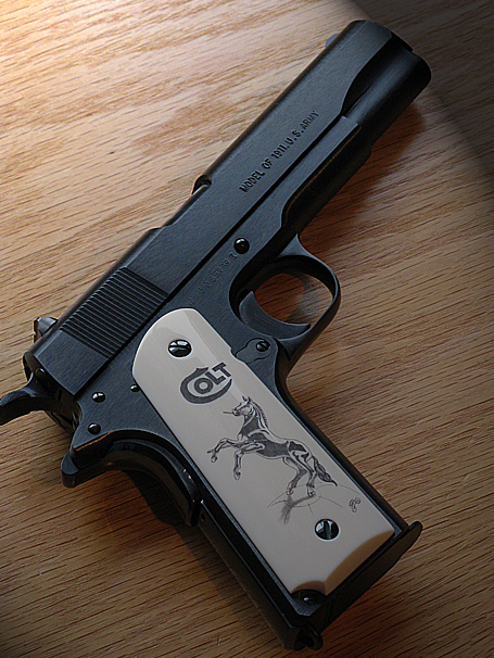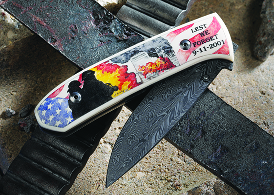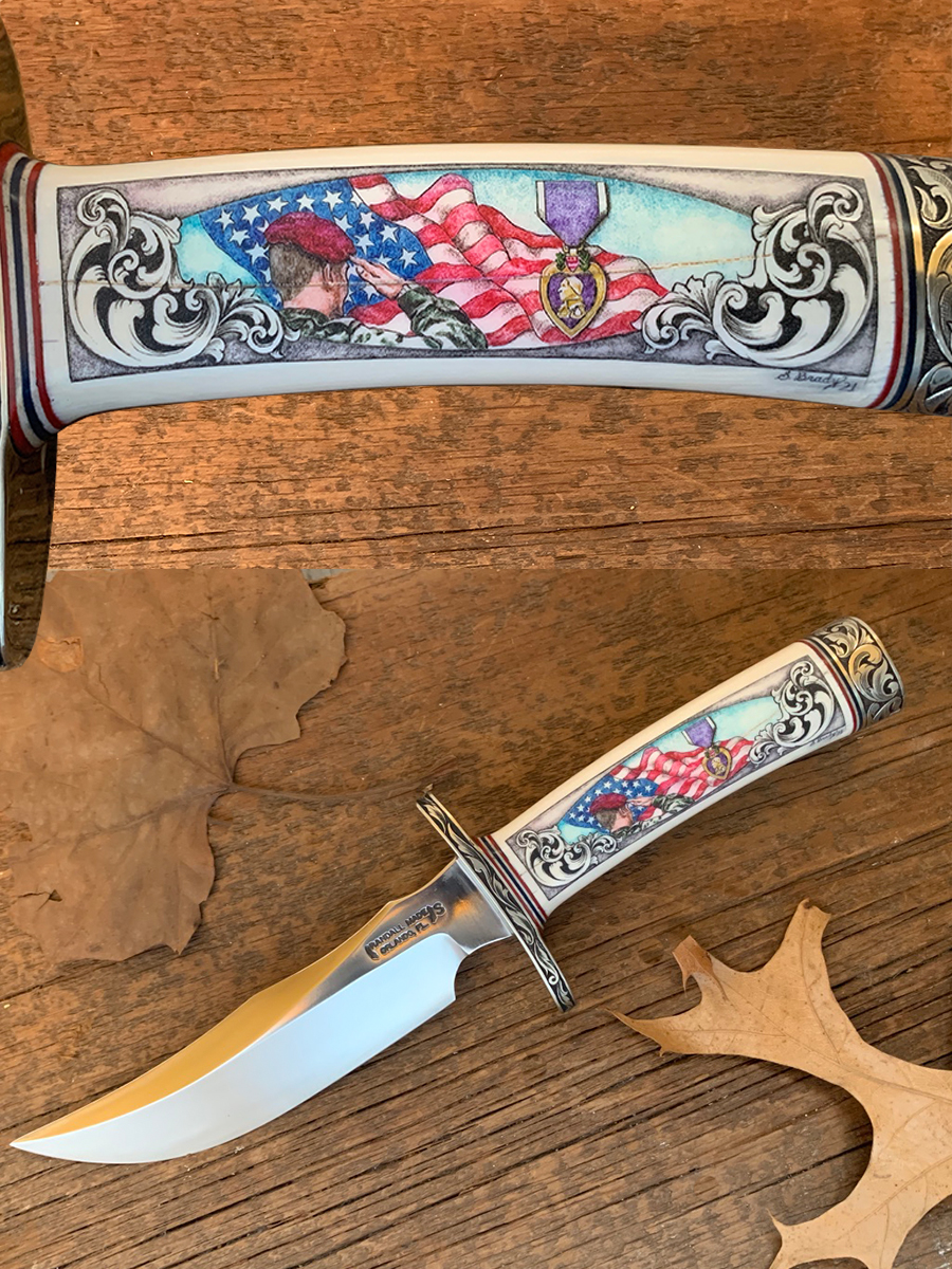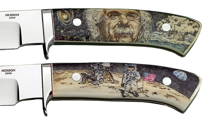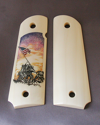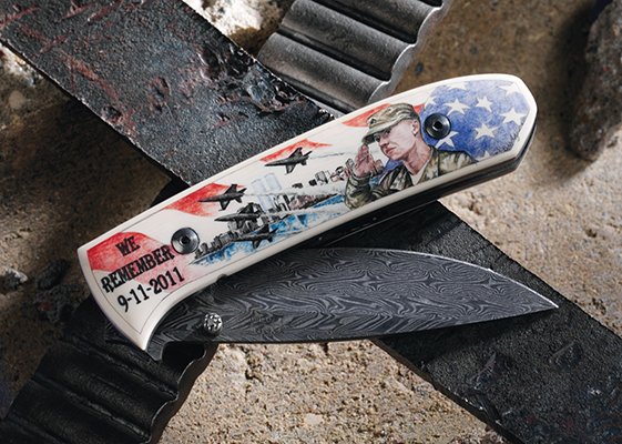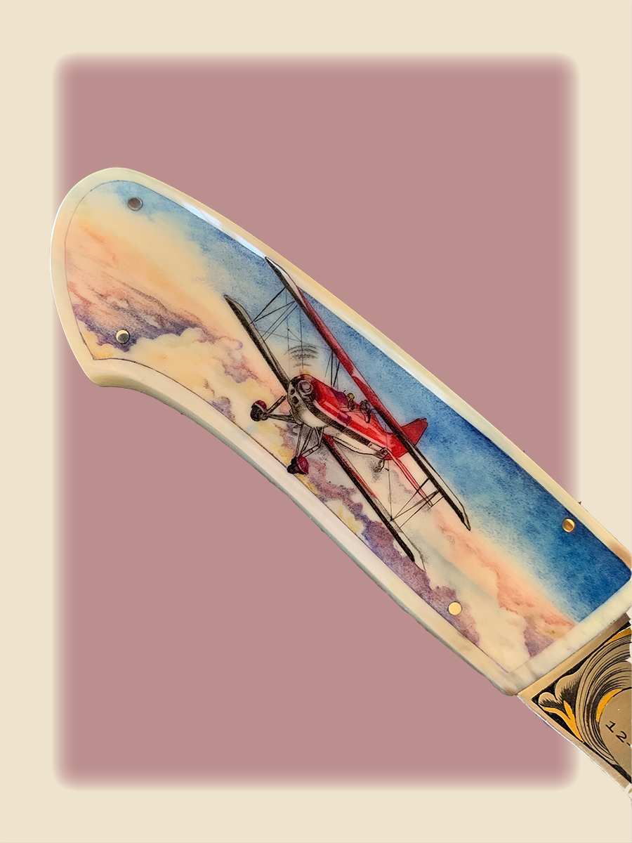 Brainchild of Master Engraver Brian Powley (Bloomingdale, Ohio), the .45 caliber Colt 1911 ACP Pistol honors Ohio’s premier place in the most significant moments in aviation history. A beautifully engraved piece, the “Wright” side of this 1911 depicts the Wright bicycle shop in Dayton, Ohio, and the brother’s first successful test flight of the 1903 Flyer. Opposite that are the Friendship 7 space capsule and the first lunar walk. The resin ivory grips were created by David Warther II of David Warther & Co (Dover, Ohio). Scrimshawed by Sandra Brady (Monclova, Ohio), the grips are decorated with the foremost names in Ohio’s aeronautic past: John Glenn, Neil Armstrong, and, of course, Orville and Wilbur Wright.
