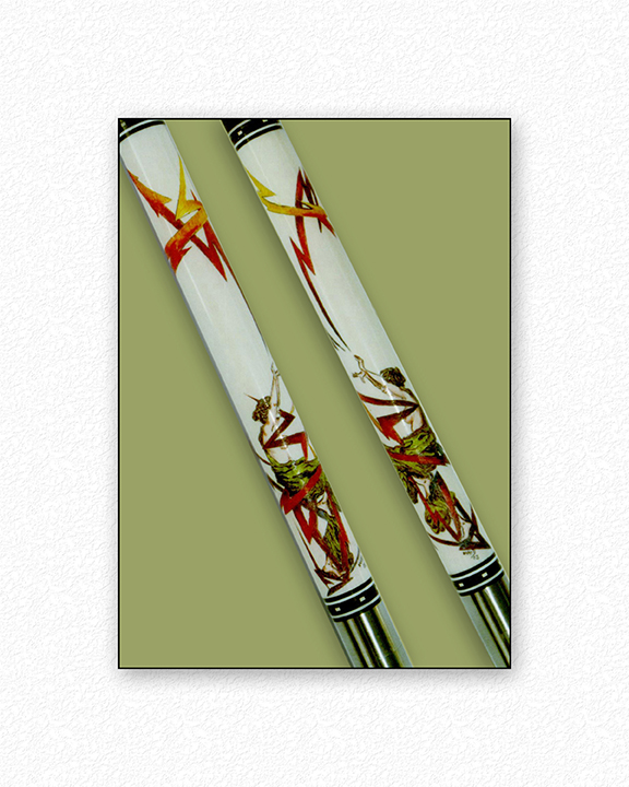 The American-inspired theme on this pool cue, beautifully custom-built by Harold, is based on ideas from the collector. Look carefully, and you will see in the details the history of our experience in the 1960s. Depicted in the lower section are colorful scenes from the Vietnam War, where the owner of this cue served. While the soldier depicted is not him, the uniform and insignias honor his service. Directly above this section is another iconic time in the 1960’s. Do you remember the marvelously decorated VW buses, the flower children, and Janis Joplin singing? These images are a vivid reminder of the peace movement and the antiwar feeling that permeated much of the younger culture. The uppermost section colorfully features the space race, moon landing, and of course, the historic ‘first step.’ Even Sputnik makes an appearance here.